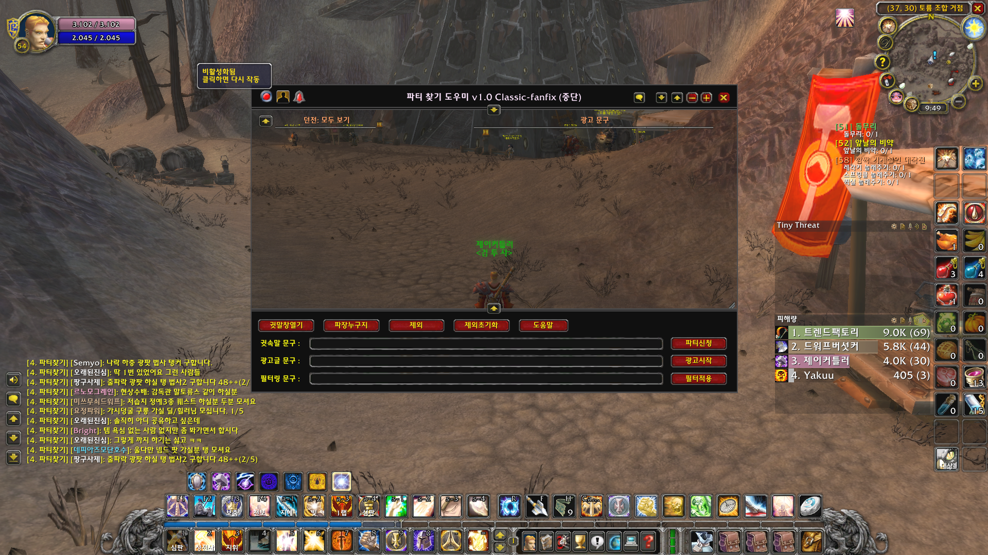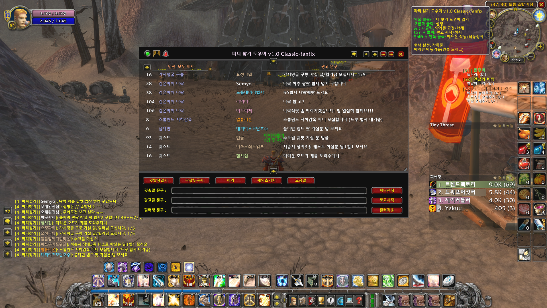 이 작업까지 완료를 하셨으면 요로코롬 새로운 채널인 파티찾기 창에서 사람들이 실시간으로 인던을 모집하는 글이 나옵니다. 참고로 이 파티찾기 창은 인던을 직접 모집하는 글만 써야 가독성이 좋아지므로 자기 자신이 "어디어디 가는 도적1 대기중" 이런식으로 홍보글은 올리지 맙시다. 한 사람이 하면 문제가 안되는데 모든 와우저들이 하면 파티찾기 채널 가독성이 X망됩니다. 그런데 여기서 끝내면 실수로 놓친 대화창으로 인해 인던을 못가는 일이 생길 수도 있습니다. 그래서 생긴 애드온이 바로 파티찾기 도우미입니다.